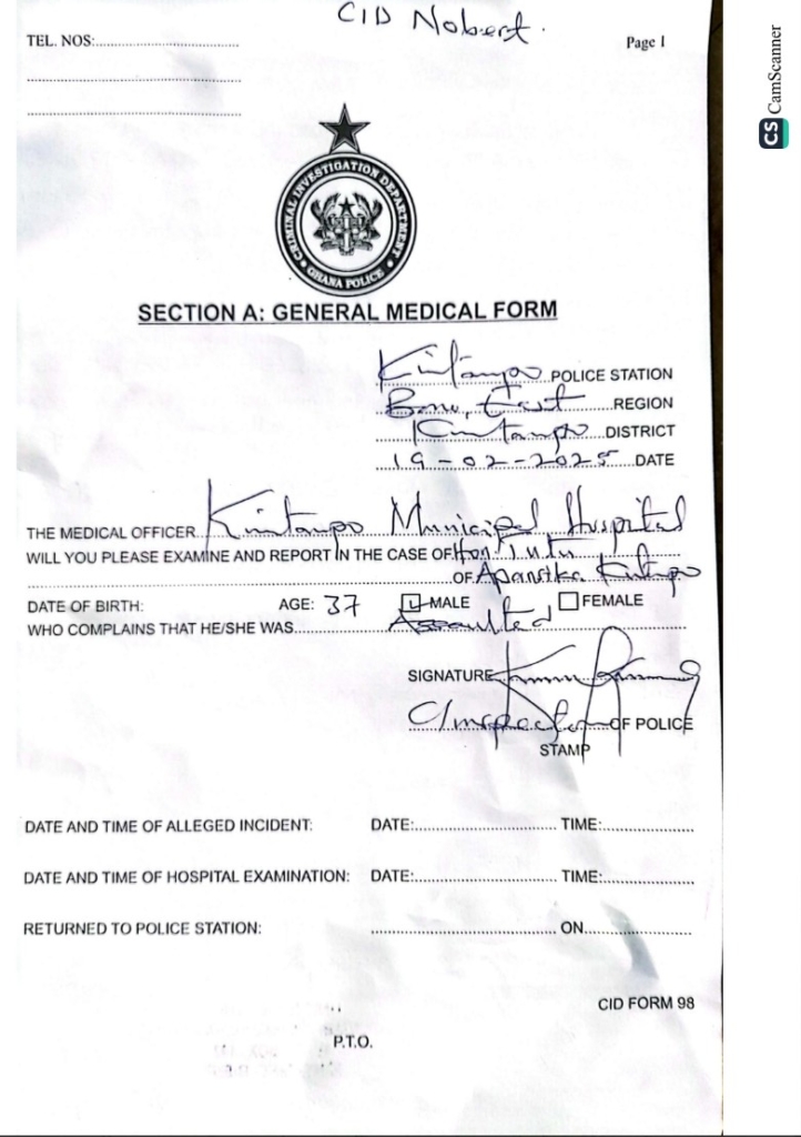 A 37-year-old assemblyman for Kwabia in the Kintampo South District of the Bono East Region, Alfred Agandaa, also known as Tutu, has lodged a complaint with the police in Kintampo following a brutal assault allegedly carried out by thugs who, he claims, acted on the instructions of Unas Owusu, the regional chairman of the ruling National Democratic Congress (NDC).