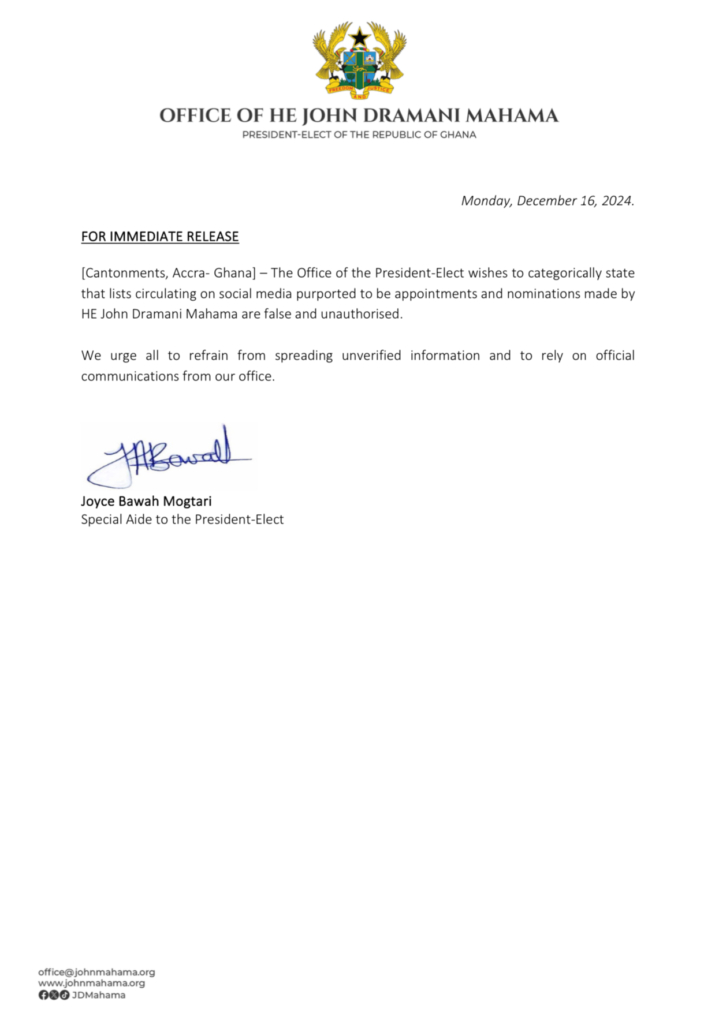 The Office of President-elect John Dramani Mahama has refuted claims that he has made ministerial appointments ahead of his assumption of office.