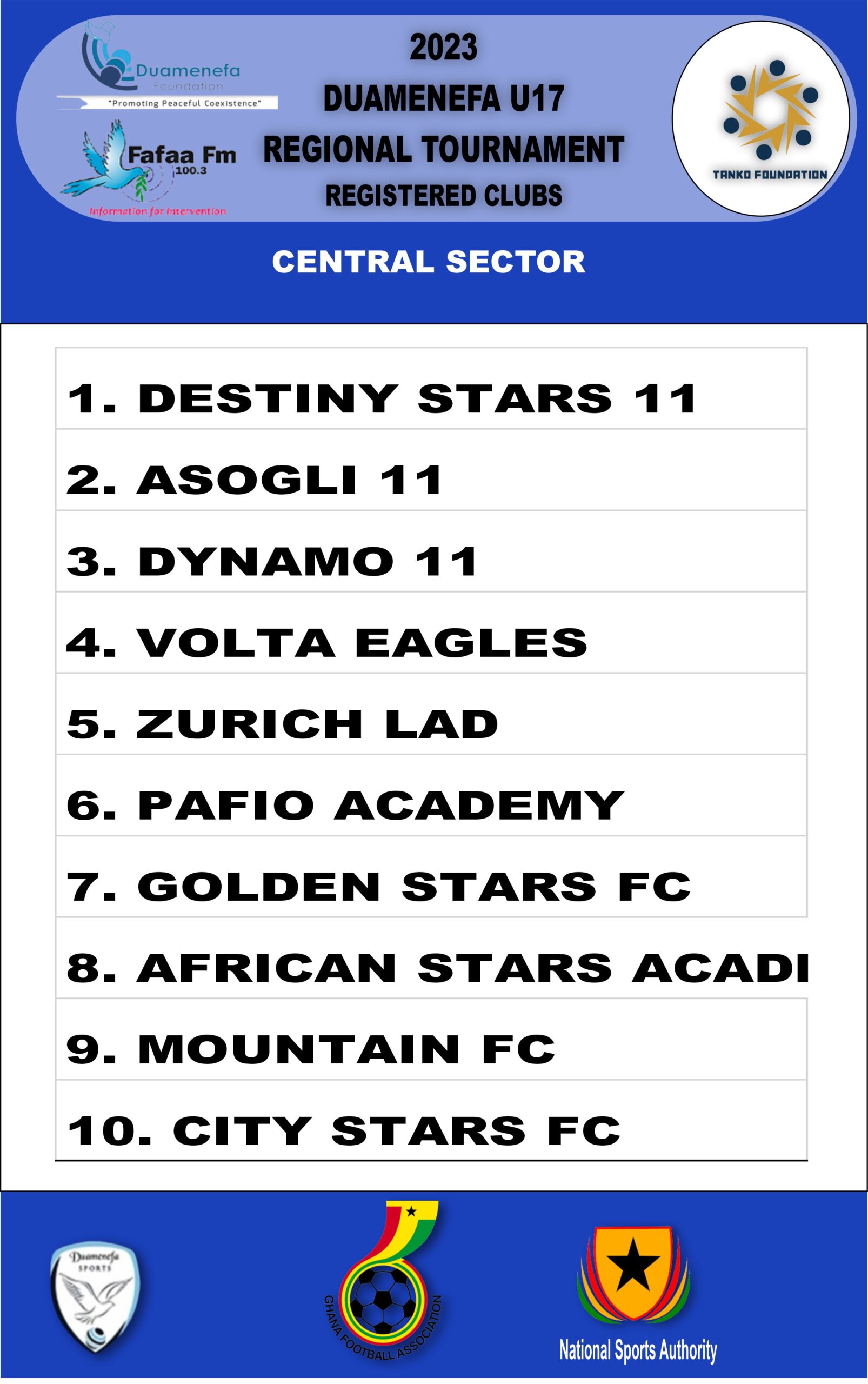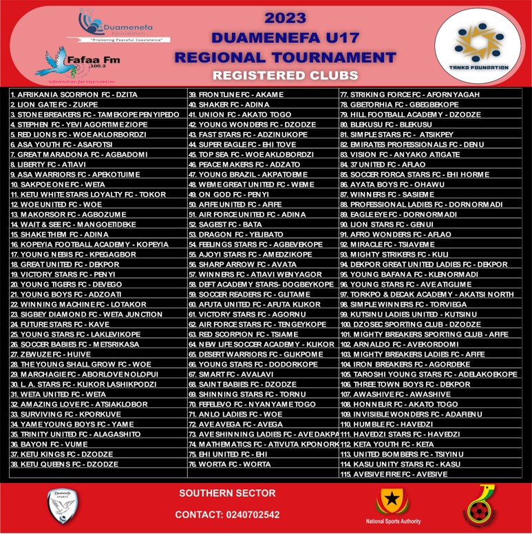 The Duamenefa Regional Tournament of the Volta Region is an initiative of a Private Commercial Radio Station called, Fafaa 100.3 FM, Dzodze with its associate NGO dubbed the Duamenefa Foundation.