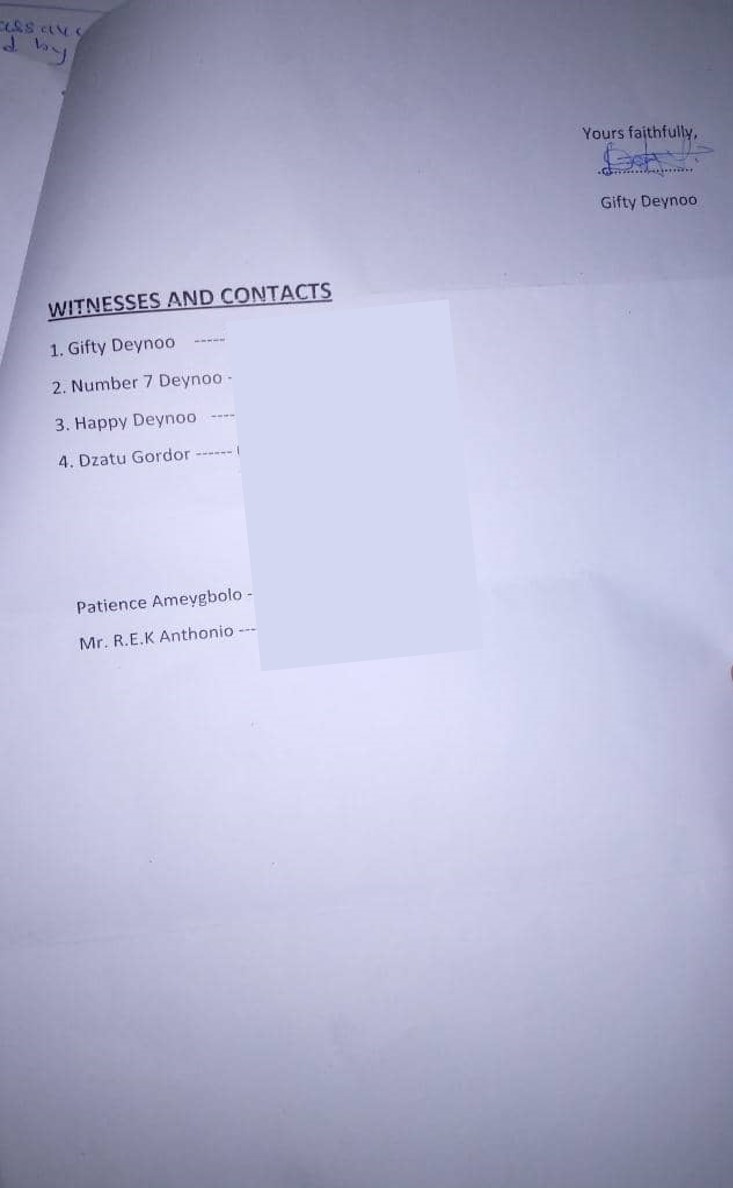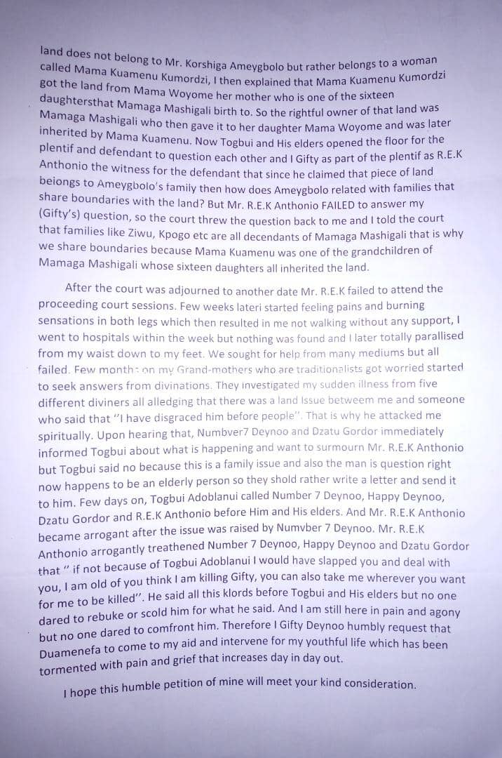 Gifty alleges in her petition that she testified against Mr. R.E.K. Anthonio over the family landed property litigation in the traditional arbitration court of Togbi Adoblanui.