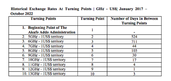 Between Turning Point 4 and 6 (March 2022 through September 2022), the number of days of relative stability declined significantly. It was during this period that government announced on July 1, 2022, that it was heading to the IMF for a bailout. During this period also, the government finally managed to pass The Electronic Levy (E-Levy) after four months of strong opposition in Parliament and public outcry. This impacted the government’s expected projected revenue from this new tax. The average exchange rate was GH¢7.7 – US$1 during this period.
